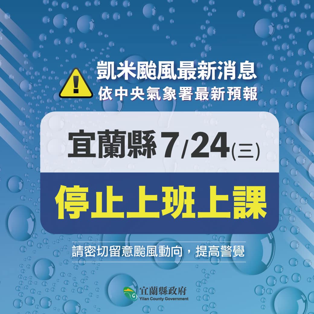 【公告】宜蘭縣明日(7月24日)停止上班及上課。Post author:林昱辰Post published:2024 年 7 月 23 日Post category:學輔處宜蘭縣明日(7月24日)停止上班及上課依據中央氣象署預報資料,受中度颱風「凱米」影響,宜蘭地區明(24)日預測風力及雨量已達天然災害停止上班、上課標準,預估風雨將持續增強,姿妙考量縣民人身安全,呼籲民眾非必要勿外出,做好防颱準備工作,並請各防災單位應堅守崗位,執行防救災工作,宣布本縣明(24)日停止上班、停止上課。相關內容宜蘭縣立南安國民中學「113學年度國家防災日演練」計畫2024 年 8 月 27 日轉知國立宜蘭高級中學辦理「112年度第三屆林燈盃宜蘭科學能力競賽」。2022 年 12 月 1 日轉知國立東華大學辦理「111學年度原住民族文化科教獎─第十四屆原住民族雲端科展暨原生科學家高峰營」。2022 年 12 月 20 日