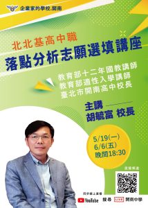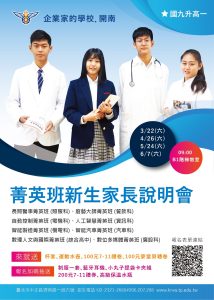 開南高級中等學校於114年3月22日、4月26日、5月24日、6月7日(星期六)上午09:00~11:30辦理「菁英班新生家長說明會」及5月19日(星期一)、6月6日(星期五)晚上18:30 辦理「基北區高中職志願選填vs落點分析」線上直播講座,請九年級學生及家長自行參加。